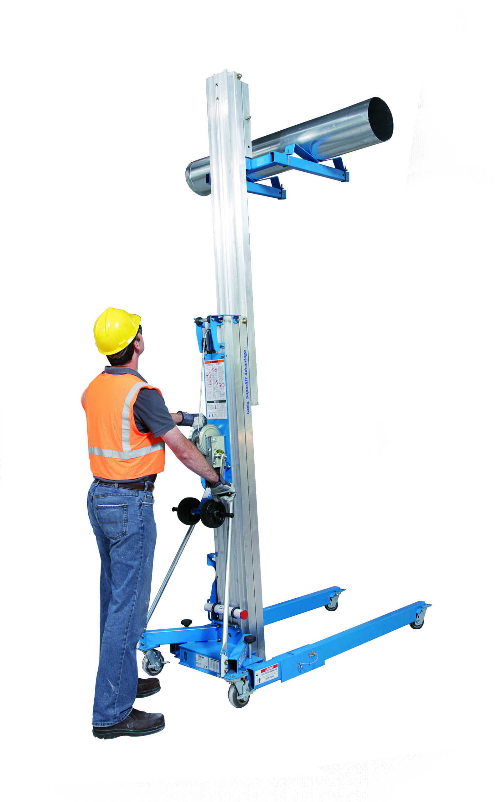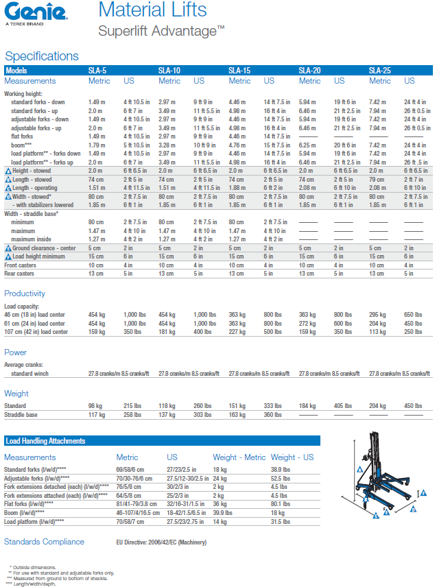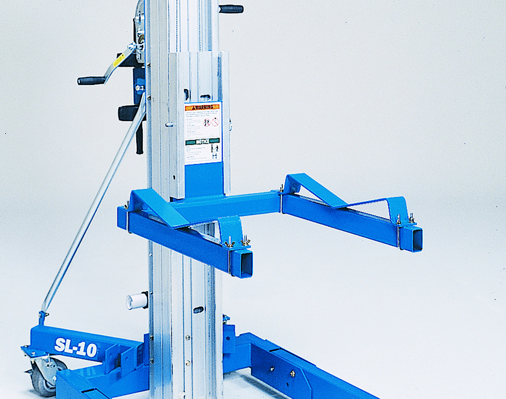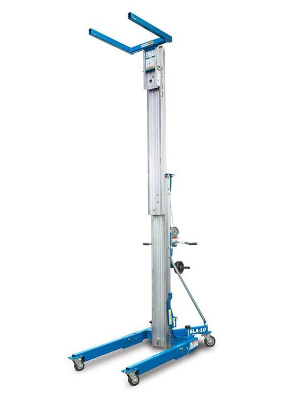 Genie® Superlift Advantage™-lifte er specialbyggede, manuelt betjente materialehejs, der tilbyder flere muligheder for lasthåndtering. Genie Superlift Advantage SLA™-10-materialehejs kan bestilles med en alsidig, justerbar grænseflade, der er ideel til håndtering af brede laster såvel som smalle døråbninger, og den kan let læsses ind i en servicevogn eller ladet på en pickup-truck.